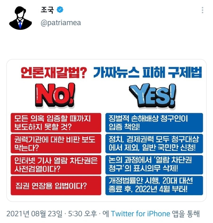 언론법·헌법학 관련 '전문가들은' "조국 사태는 다시는 일어날 수 없을 것"이라 말하였는데요. ① '기사열람차단 청구권과 정정보도 청구 표시'로 최초 의혹 보도이후 타 매체서 인용을 막아 진실을 찾기까지 필요한 시간을 못가지게 만들고 ② '고의중과실 추정과 징벌적 손해배상제'는 조 전 장관이 그러했듯이 언론에 잇단 소송을 제기해 후속 취재를 막을 수단으로 악용될 것이라고 말하였습니다.