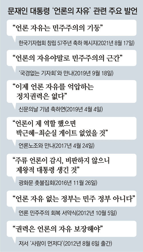 文대통령은 언론 관련 법률에 "남용 없도록 면밀히 검토돼야" 한다고 '소신을 밝혔는데요'. 민주국가 '세계 최초'라는 초유의 사태로 언론중재법이 'UN 인권 문제'로 번졌습니다. "언론에 대한 민주당의 태도는 최근 4~5년간 180도 바뀌었고, 그 변화에 맞춰 언론중재법안 내용도 계속해서 바꿔왔습니다." 소리를 여기서 하는 것 보다 '여기서 확인'하면 되겠습니다.