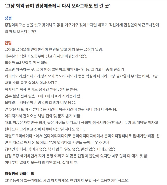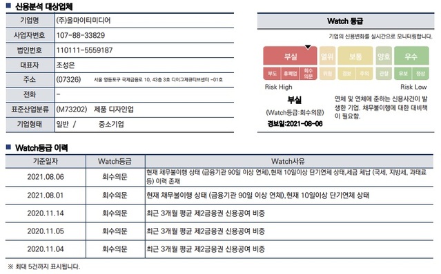 조 씨가 대표로 있는 '올마이티미디어'가 채무불이행·단기연체·세금 체납 등을 겪고 있는 것으로 확인됐습니다. 조씨 회사 '올마이티미디어'는 올해 8월 1일 기준 '채무불이행' 상태로 부실 등급으로 분류됐는데요. 기업 정보를 공유하는 사이트인 '잡플래닛'에 기재된 글에 따르면 조씨의 회사를 향해 "그냥 최악(인 회사), 급여 밀리기 일쑤, 4대 보험도 미납"이라 말하였습니다.(↓)