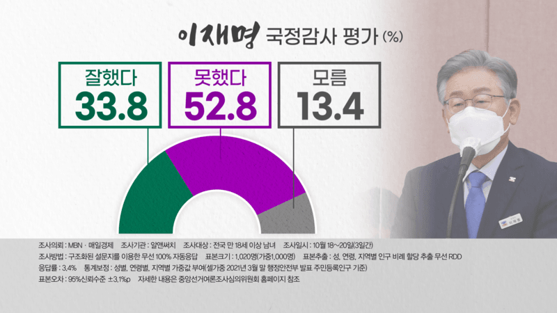 '알앤써치'에서는 국민의힘 지지율이 40.4%로 민주당과 10%p가 넘는 차이가 났습니다. 대선판을 강타한 '이재명 게이트'는 응답자 절반가량인 45.9%가 '대(장)동세상' 창시자(설계자, 결재권자) 이 지사가 직접 관련이 있다고 응답했고, "왜곡과 선동으로 가려졌던 '줄기와 본질'이 드러났다"는 국정감사는 52.8%가 못했다고 평가했습니다.