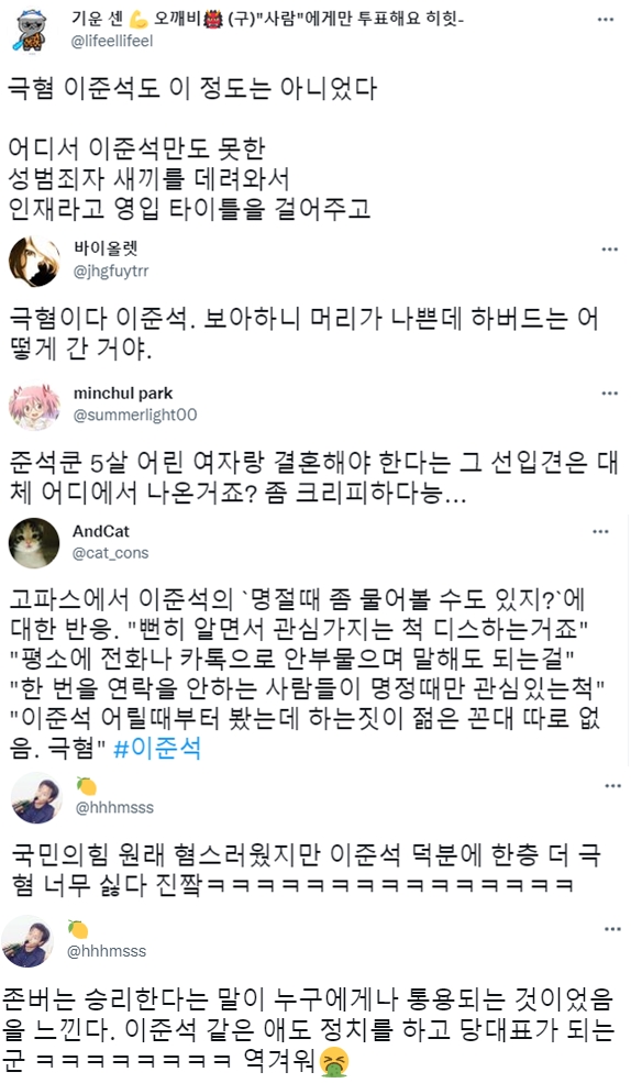 국민의힘 코어 지지층들 뿐만 아니라, MZ녀들은 축대남의 상징이 된 ③ "이준석 극혐", "이준석 보기 싫어서" 소리가 꽤 심각한 수준입니다. "이별 통보한 여고생 차에 감금·폭행한 20대 체포", "초등학생 감금·성범죄 20대 구속" 등 여권에서는 '이준석 리스크'를 정조준 중입니다.