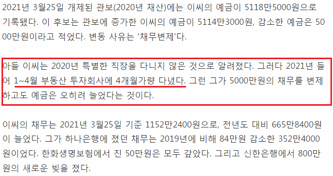 5,000만원의 빚이 있던 이 씨는 부동산 투자회사에 4개월가량 다닌 후 5,000만원의 채무를 변제하고도 예금이 늘었던 것으로 확인됐습니다. 무슨 회사가 인턴한테 월 약 1,000만원 이상의 월급을 준 것이고, 왜 동생 "YouKonw" 씨의 예금도 비슷한 흐름을 보였는지에 대한 의문이 있습니다.