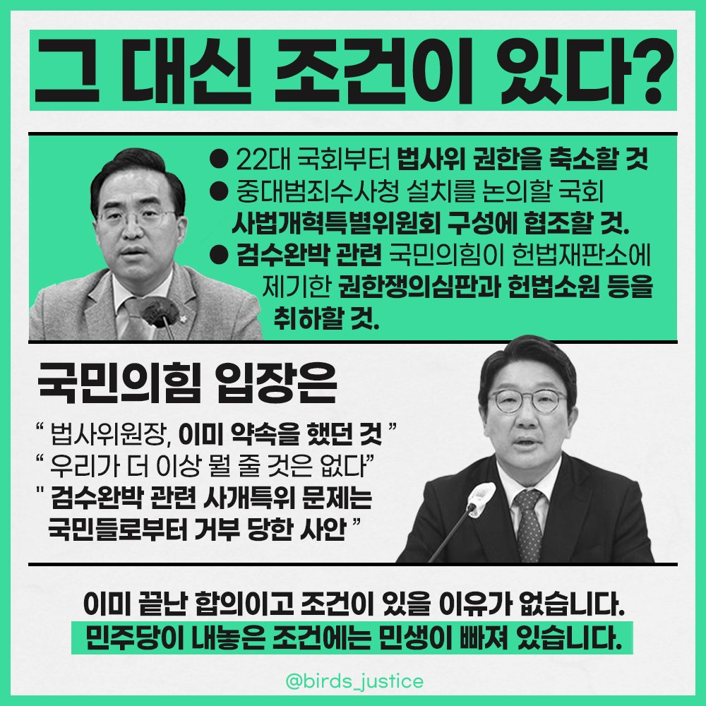그러자 강경 극좌에서 "정권도 뺐겼는데 법사위에서 막혀버리면 법안 하나 제대로 통과 못한다. '개혀억' 드라이브로 강하게 견제할 수 없다"는 바보같은 논리가 생겼는데, 그냥 윤석열 대통령이 거부권 행사하면 됩니다.