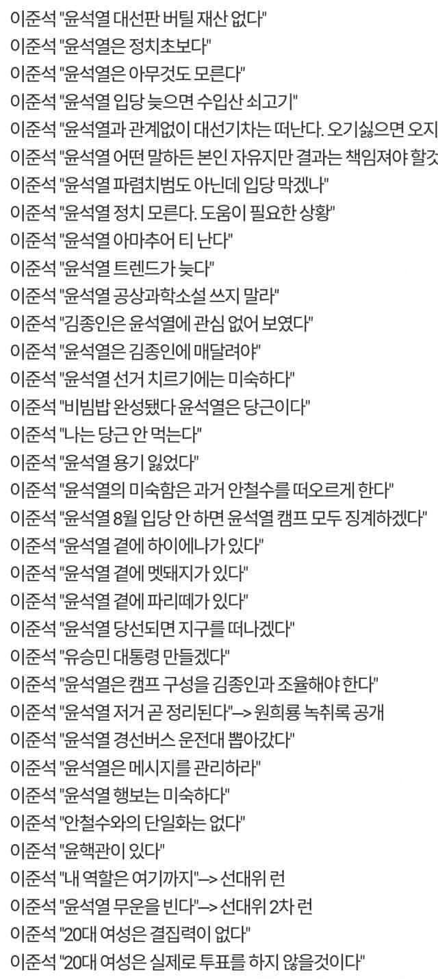 이준석에게 반드시 책임을 물어야 할 것은 '성상납, 알선수재 증거인멸 교사 및 증거위조'만이 아니라, 하도 "최고의 선거 전략가, 홍보의 귀재이자 비단 주머니들로 중무장을 한 '선거의 신'이다"니, '대선·지선 평가'가 있습니다.
