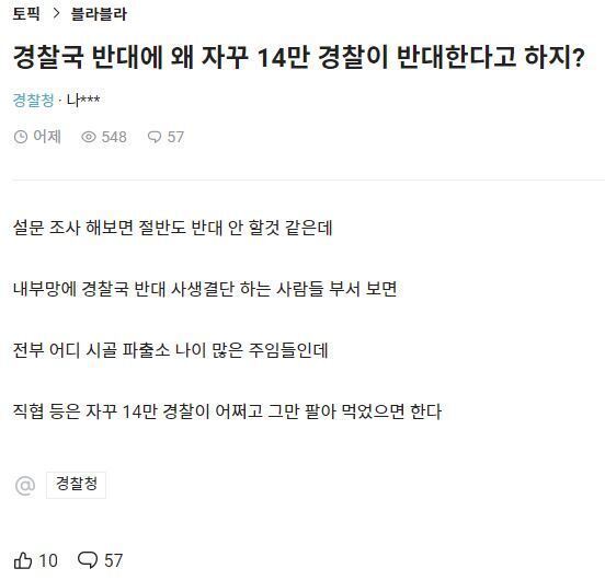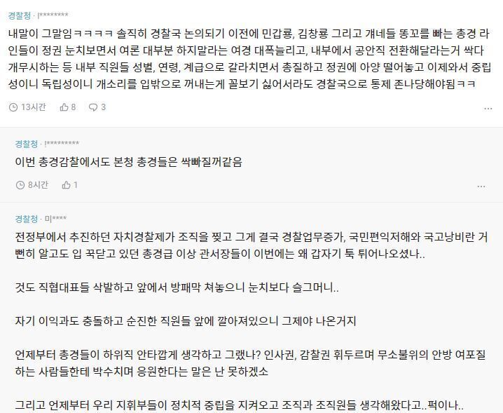 직장인 익명 커뮤니티 블라인드 경찰 내부 게시판에서도 지난 25일 "'총경회의?' 현장 경찰관 힘들다 할 땐 콧방귀도 안뀌더니, 국민 생명과 안전에 직결되는 현장 목소리에는 무관심했으면서 지휘부 자기네 권한 뺏기려고 하는 덴 반응이 빠르다”는 불만이 나오는 중입니다.