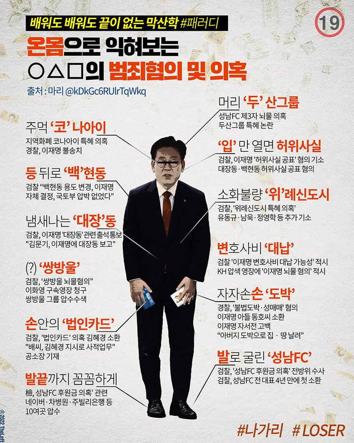 '조국 → 추미애 → 이재명 씨' 트리오 없었다면 난공불락 급의 민주당을 졌지만 잘 싸워 입으로 '들어 먹은' 이재명 씨가 큰일 해주는 중입니다. 뭘 자꾸 찢는 이 씨부터 '도박중독' 추방의 날을 빛낸 장남은 "여자 '사 먹어라'", 조카는 스토킹 보복 살인에 부인은 법카로 살림살이를 하고 의료법을 위반한 혐의로 구속되게 생겼는데요.