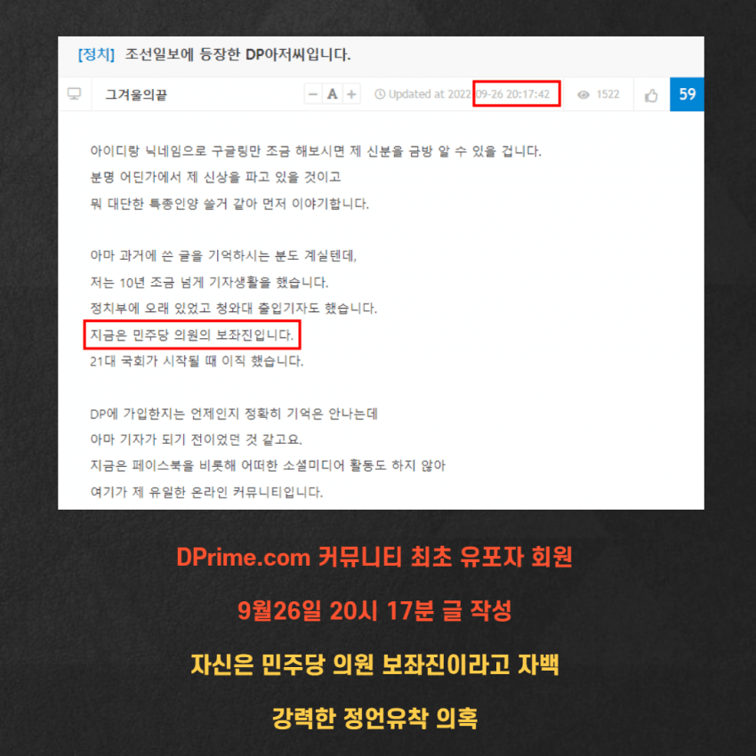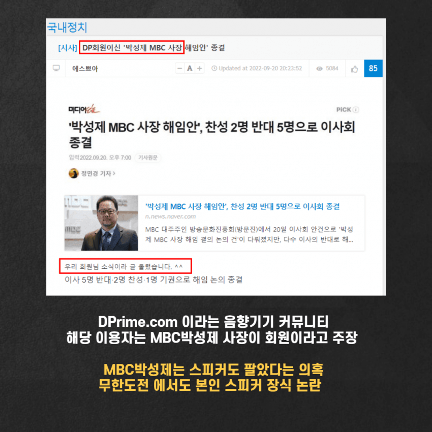 3. 오전 09:00 정각에 온라인 커뮤니티에 지라시 내용이 최초로 올라온 곳은 MBC 사장 박성제 씨가 '회원'으로 '1,200만 원'짜리 스피커를 파는 중인 'DPrime'이었습니다.('아카이브')