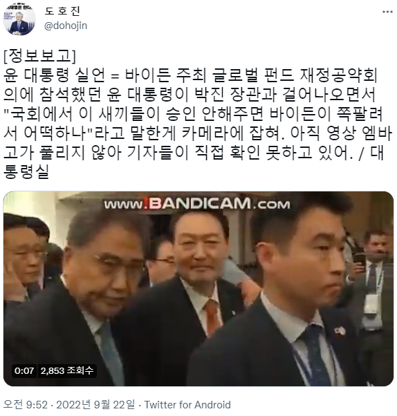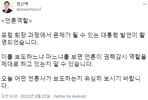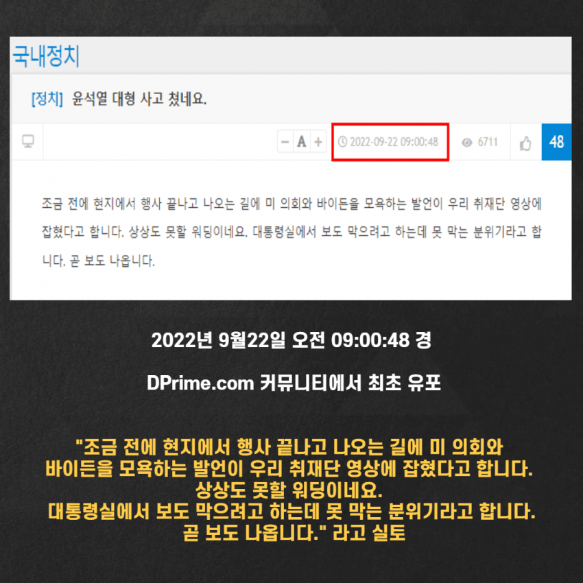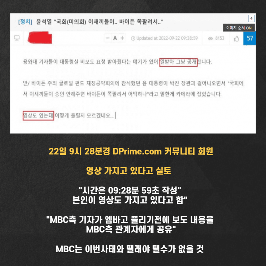 2. 오전 7시 40분 경 뉴욕 현지 순방 취재단 기자들 사이에서 "날리믄" 발언이 있다는 걸 MBC 기자 '이기주'가 기자 단톡방에 '지라시 워딩'을 최초로 올린 것으로 전해졌습니다.