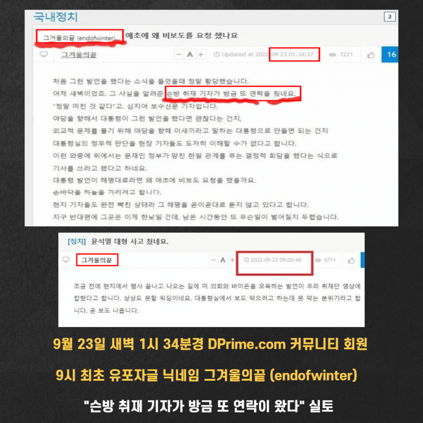 최초로 커뮤니티에 올렸던 닉네임 : 그겨울의끝(ID : endofwinter)은 엠바고 걸린 걸 "순방 취재 기자가 방금 또 연락을 줬다"길래 기자인가? 의구심이 들어 한경오와 노컷에서 찾아보니, 문재인 전 대통령실 출입기자였던 오마이뉴스 '법조팀장', ★ '최지용' ID가 endofwinter였습니다.