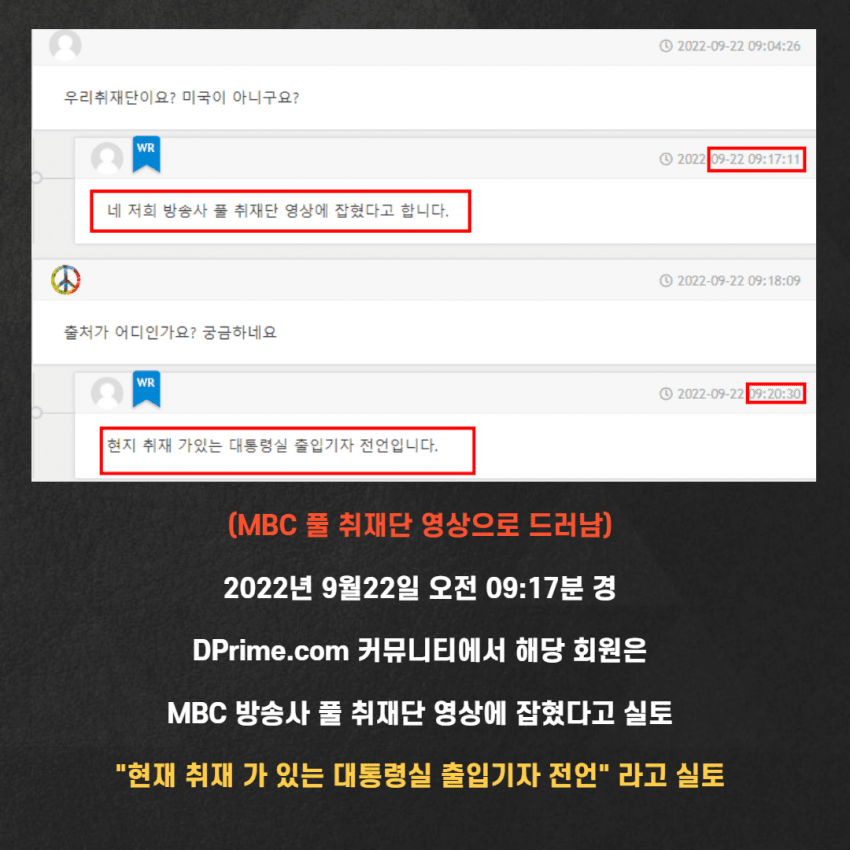 1. 9월 22일 오전 6시 28분 풀 기자단 '당번' MBC 민노총 노조 부위원장 출신 ★ 박종일 카메라 기자가 촬영한 52분 분량을 12개 방송사에 동시 송출했고 종료된 시각이 오전 7시 30분으로 확인됐습니다.