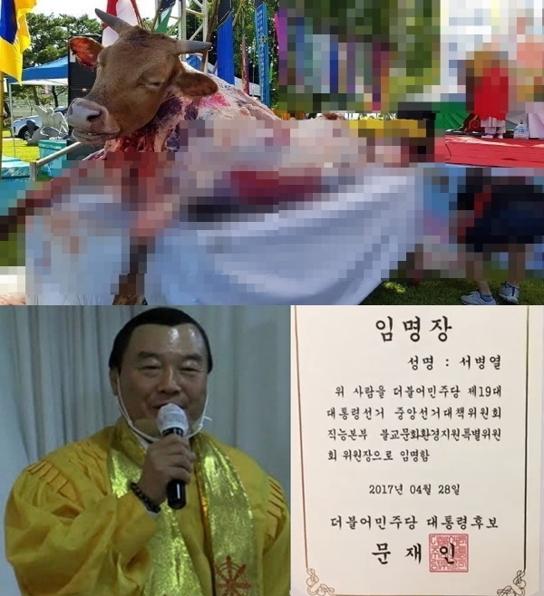 세계소방관경기대회 안전 개최 기원 종교행사에서 살아있는 '소 가죽을 벗겨' 제물로 바친 대한불교종정협의회 사무총장 서병열 씨는 헌법기관인 대통령 직속 민주평화통일자문회의(의장 '문재인' 전 대통령) 제20기 자문위원에 위촉돼 활동했는데요.