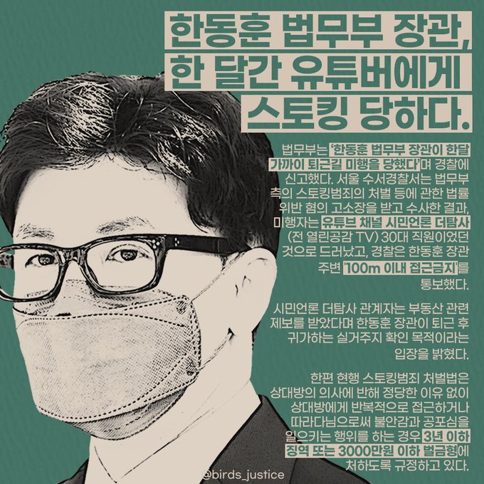 '끔찍한' 스토킹 범죄가 검경 강경대응에도 멈추질 않는 중에 한동훈 법무부장관을 스토킹한 유튜버 '더탐사'를 전 동료 유튜버 열린공감TV가 꾸짖었습니다. 열린공감TV는 '쥴리'를 만들어 퍼트린 채널이고, '돈 때문에' 대판 싸우더니 멤버가 갈라져 더탐사 채널을 만들었으며 최근 김의겸 씨, 김용민 의원 등이 출연해 한동훈 장관에 대해 적대적·비난을 했던 채널입니다.