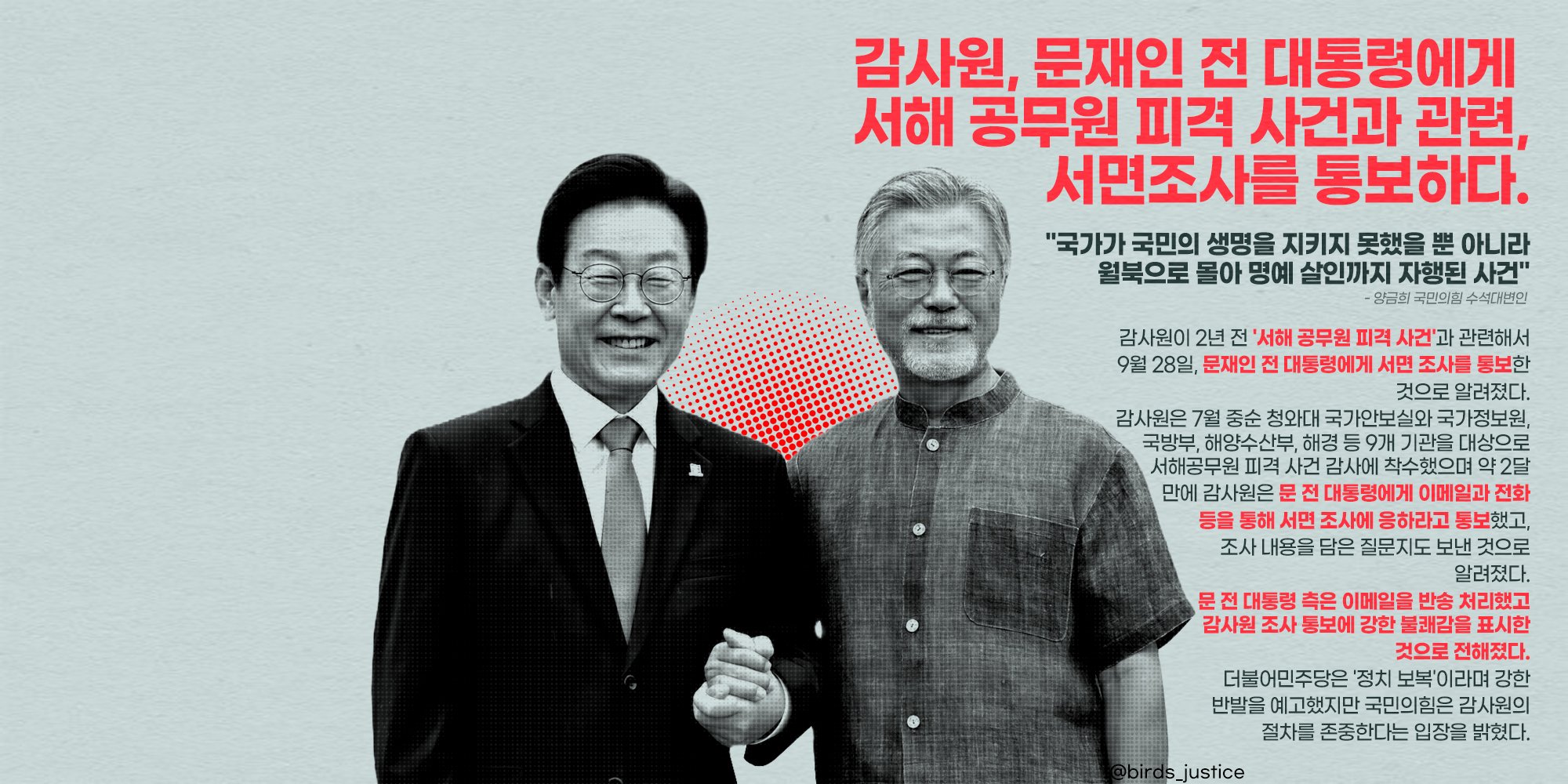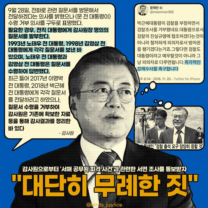 "태도가 본질이다" 맨날 '진실규명' 외쳐놓고 '대단히 뻔뻔'한 '문재인' 전 대통령이 '본인이 임명'한 감사원의 서면조사를 부정하면서 감사원 조사를 거부했습니다. 전 대통령으로서 감사원의 진실규명에 협조하겠다는 것이 아니라 철저하게 피의자로서 방어권을 챙기겠다는거죠. 그렇다면 검찰도 전 대통령이라고 예우할 것이 아니라 그냥 피의자로 다루면 됩니다. 즉각적인 강제수사를 촉구합니다.