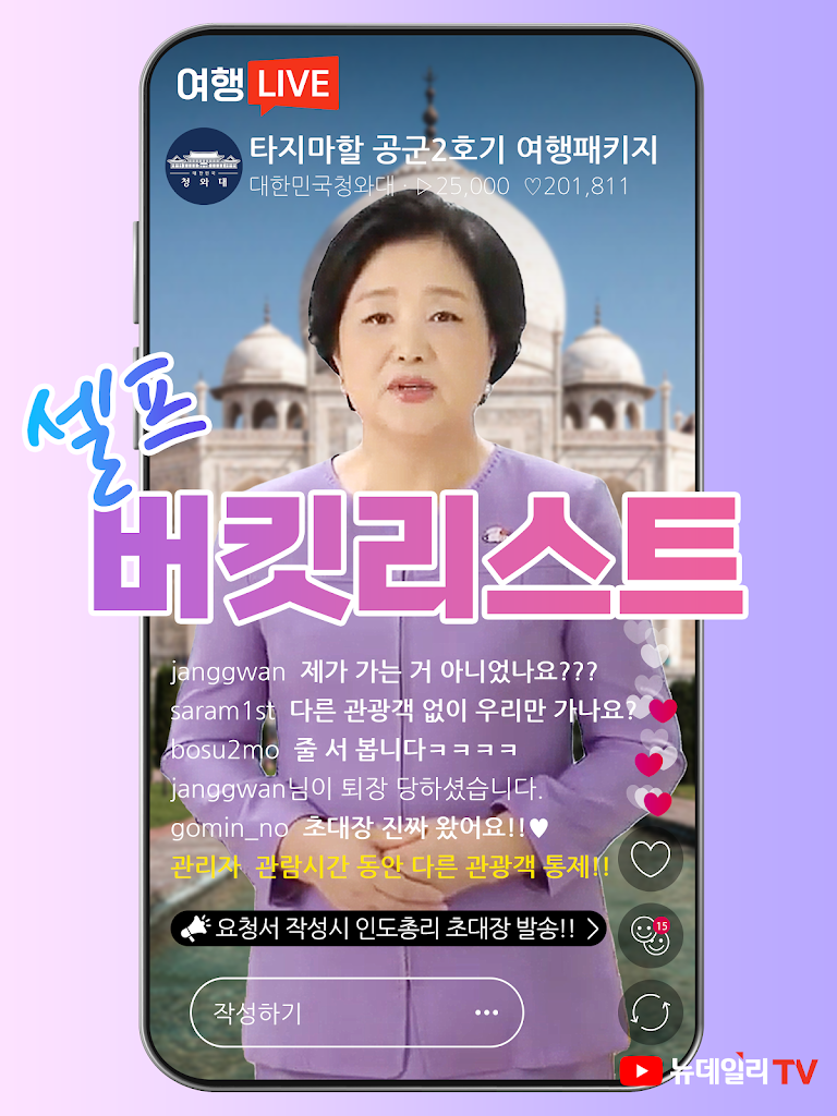 못 입던 옷, 못 메던 백, 못 차던 귀금속과 못 신던 구두들을 '버킷리스트'에 담아 못 가본 세계여행을 다녔다는 김정숙 여사가 2018년 인도 타지마할 단독 해외순방 당시 대통령 휘장을 달고 다녀왔는데요. 대통령 휘장 달고 '대통령 행세'를 했다는 건데 '대통령 공고 제7호 대통령표장에 관한 건' 위반이었습니다.