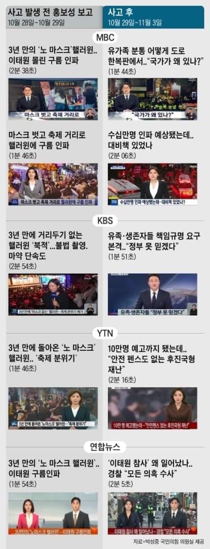 MBC와 공영방송들은 "3년 만의 노 마스크 핼로윈데이 축제다"면서 홍보를 했고 매우 우연스럽게도 사고 발생 당일 오세훈 서울시장은 해외출장 중이라 모든 비난의 화살은 '윤석열 정부'에 쏠리도록 세팅이 됐는데 때마침 '수상한' 여론조사 + '유승민' 전 의원이 내부총질을 했습니다.