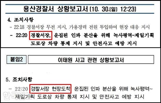 '용산경찰서장'은 참사 직후 외부 인력 요청을 따로 하지도 않았으며 사고 발생 29일 오후 10시 15분부터 1시간 15분이 지난 11시 30분에야 외부 인력을 요청했고 구급차 통행로 확보 지시도 자정쯤 이뤄져 미리 인력을 많이 투입했다면 구조대가 더 빨리 올 수 있었다는 게 사실입니다.