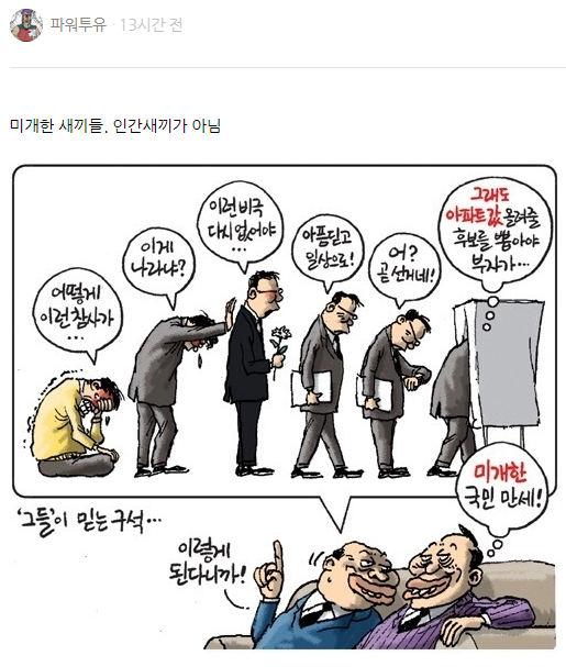 야권에서 "어떻게 이런 참사가.. 이게 나라냐? 이런 비극 다시 없어야.. 아픔딛고 일상으로! 어? 곧 선거네! 그래도 아파트값 올려줄 후보를 뽑아야 부자가.."라며 지난 '5년간 시체'가 모잘랐는지 "미개한 xx들이 인간xx가 아니다"면서 가짜뉴스를 유포 중입니다.