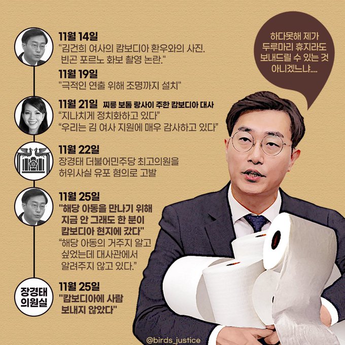 그러자 '하루도 지나지 않아' "(장경태) 캄보디아에 사람 보냈다 → (장경태 의원실) 아니다, 사람 보낸 적 없다 → (또 거짓말 논란이 일자) 아니다, 마침 현지에 가신 분이 계시다."고 했습니다.