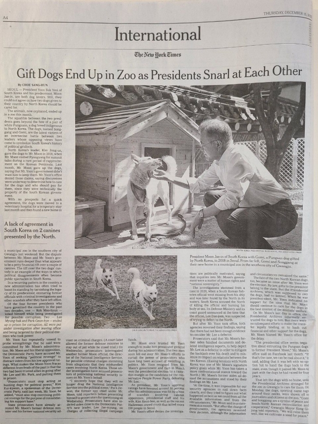 NYT에선 문재인 전 대통령의 '풍산개 파양' 사태를 두고 "평화의 상징이 '정치적 희생양'이 됐다"고 했고 독자들은 "어떻게 야생 동물도 아닌 사람과 살던 개를 동물원에 넣을 수 있느냐"는 등 비난이 쏟아졌습니다.