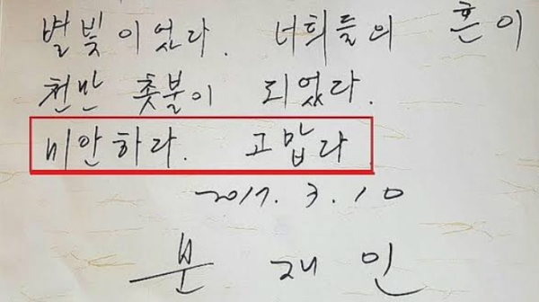 (1) 구체적이며 작위적으로 공표하지 않아도 될 일을 구체적으로 적시한, 변호사 자격증이 있는 전직 대통령이 썼다고는 믿을 수 없는 단어 선택과 문장 전개는 애완견에 쏟았던 애정은 전혀 느낄 수 없었고 '세월호 방명록'을 연상시켰습니다.