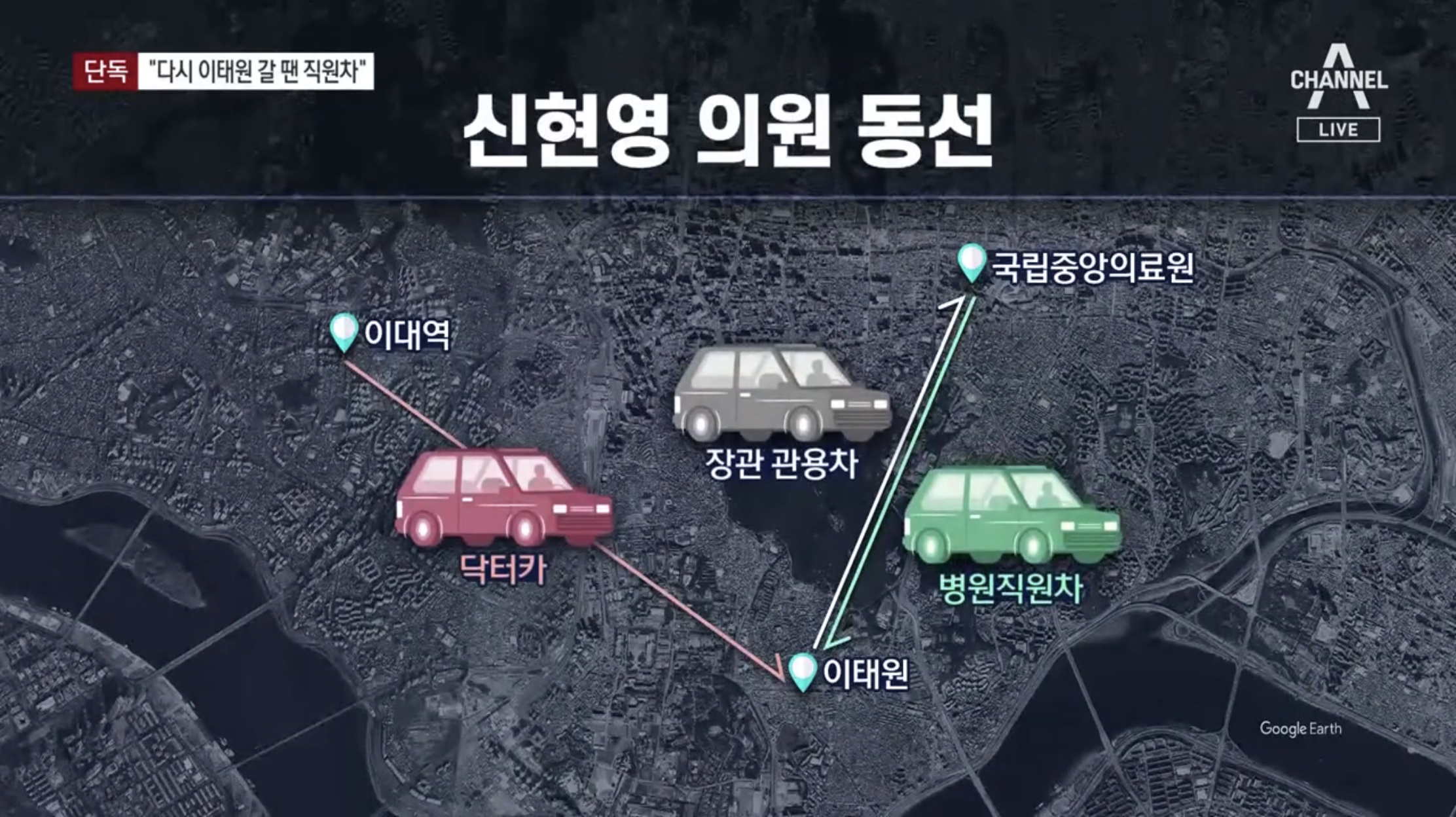 하지만 보건복지부로부터 제출받은 이태원 참사 당일 '명지병원 DMAT팀 차량 시간대별 이동 경로 자료'에 따르면, 명지병원 DMAT가 탑승한 사건 당일 차량은 신현영 의원이 거주 중인 아파트 단지와 '도보로 3분' 거리인 이태원 5번 출구를 경유 했고, "중간지점에서 탔다"는 신현영 의원이 거짓말을 친 게 확인됐습니다.