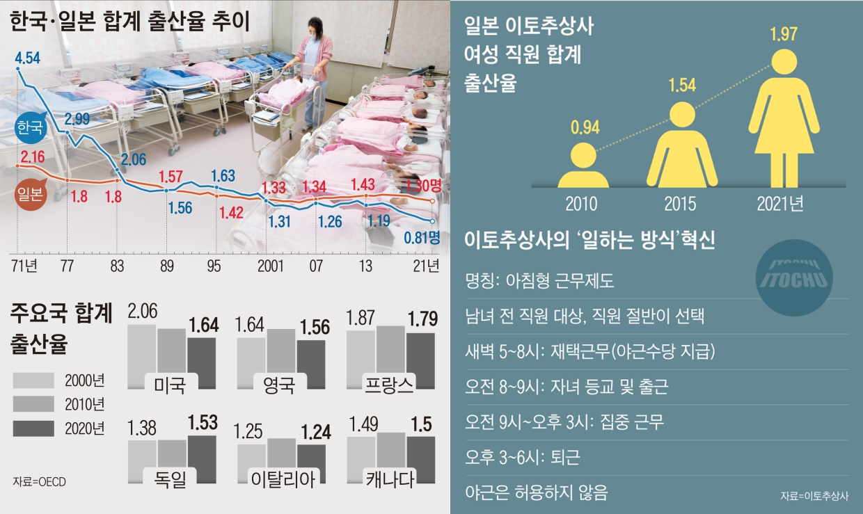 2010년 여성 직원 출산율이 0.93명이었던 일본의 한 무역회사는 '일하는 방식'의 혁신으로 2021년 여성 직원 출산율이 1.97명을 기록했습니다. (사회 '안전'과 관련된 여경 논란은 문제가 있어 보이지만) '숙직은 커녕'은 야근도 허용하지 않습니다. 같은 해 일본 평균 1.33명을 크게 상회할 뿐 아니라, 인구 감소 저지선인 2.1명에 근접한 수치였습니다. 출산율 대책이라기보다는 기업의 인적 경쟁력 강화책이었습니다.