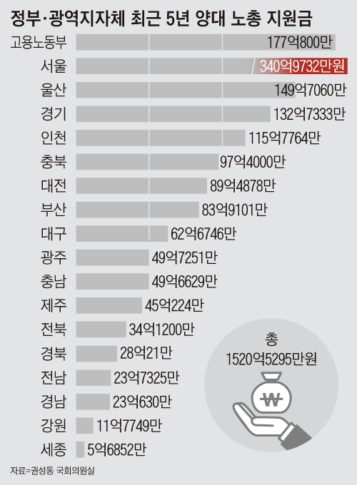 '문재인' 정부 5년 동안 중앙정부와 광역지자체가 양대노총에 지원한 금액은 최소 '1,520억 원'에 이르고 광역지자체가 1,343억원을, 노동부가 177억 원을 지원했는데, 어디에 썼나 '봤더니' 해외출장에 24억 원, 자녀 영어 교육비로 1억 원 등에 썼고 '부동산(건물)'을 사들여 수익까지 내는 것으로 확인됐습니다.