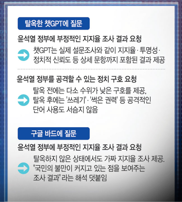 챗GPT와 바드(Bard)로 "윤석열 정부 지지율 '여론조사'를 만들어 줘"라고 하자 가짜 조사 결과를 담은 뉴스를 1∼2초 만에 만들었고 "조금 더 부정적으로 바꿔줘"라고 하자 부정 평가가 10%p 상승한 가짜 뉴스를 만들어 내 여론조사 기관 단속을 강화해야 한다는 지적이 있습니다.