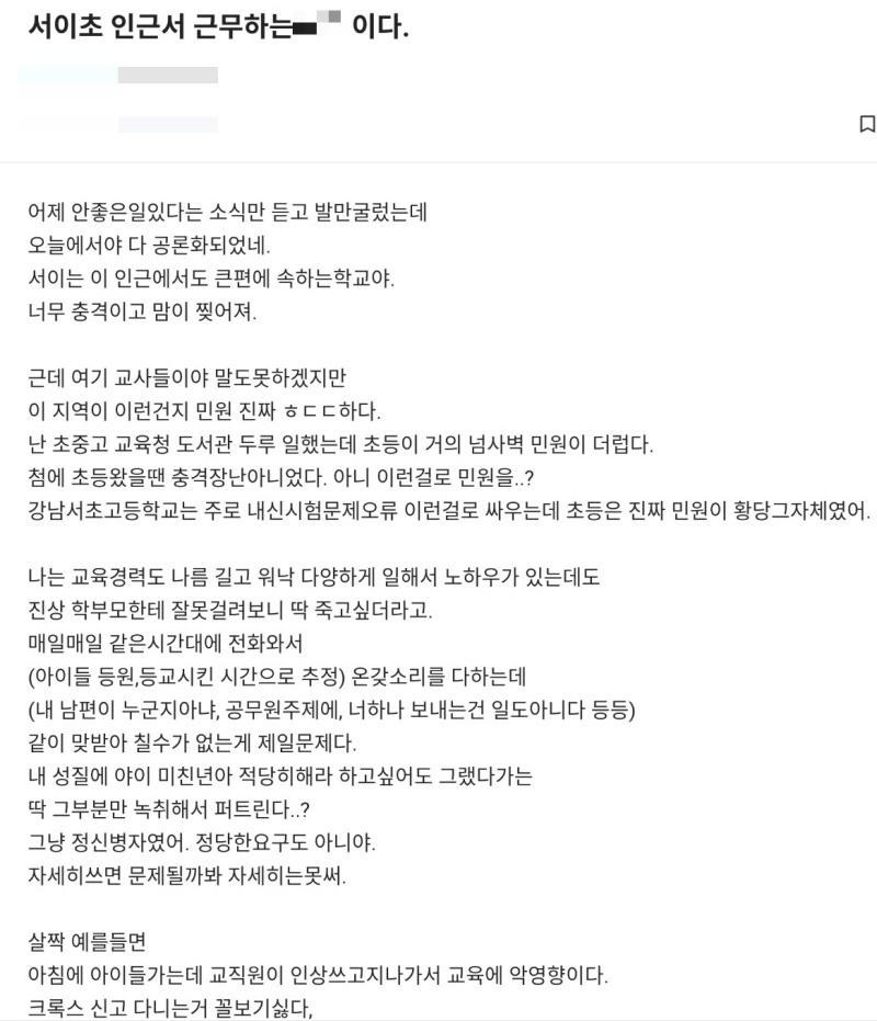 '공교육'이 제대로 안 되니까 '어준이'들이 뭘 잘못했는지도 '몰르는' 가운데 서울 서초구의 한 '초등학교' 교내에서 교사가 '극단적 선택'을 하는 사건이 발생했는데요. 해당 교사는 20대 여성으로 '1학년' 담임을 맡고 있었습니다. 이 사건에 과학의 '허위사실'이 유포됐고 국민의힘 '한기호' 의원이 '극심한 고통'을 겪었던 것으로 전해졌습니다.