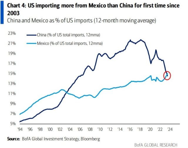 미국은 중국 '의존도' 축소에 적극적이죠. 중국의 대미 수출액이 멕시코에게도 뒤쳐졌는데요. 미국 전체 수입액에서 차지하는 국가별 비중 변화를 보여주는 그래프에서 멕시코가 중국을 제친 것을 발견할 수 있습니다. WSJ는 "'성장 엔진'이 꺼진 중국이 시진핑 주석에 집중된 권력 독재 때문에 올해 최악의 '경기 침체'에 대한 대응을 지연시키고 있다"라고 했습니다.