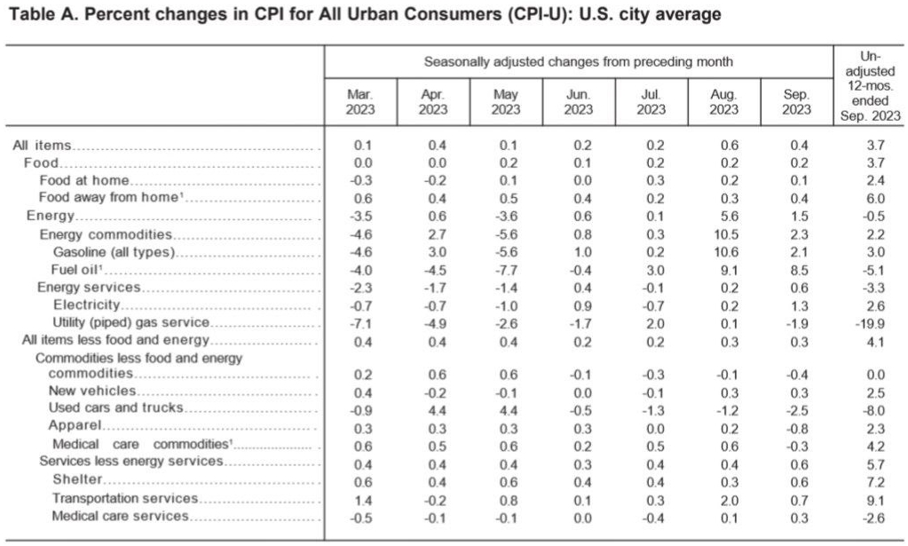 시장 전망치를 '상회' 한 9월 생산자물가(PPI)는 소비재 가격에 반영된다는 점에서 소비자물가(CPI)의 선행지표가 되죠. 미국 '노동통계부'에서 9월 CPI가 발표됐습니다. 헤드라인 CPI는 전년 동월 대비 3.7% 상승했으며 시장 전망치인 3.6%를 상회했습니다.