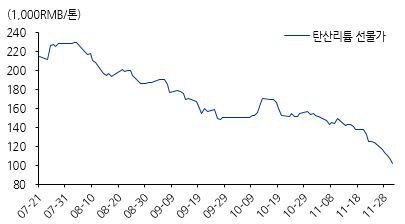리튬 가격이 또 급락을 했습니다. 탄산리튬 1월물 종가가 101,750 위안으로 전일 대비 -4% 하락 마감을 했습니다. 이번 주 5거래일 연속 하락을 하며 -19% 급락을 했습니다.