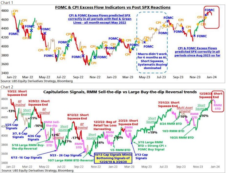 UBS Trader는 SPX -10% 추가하락이 가능하고 대형주 및 QQQ는 더 하락을 예측했습니다. 24년 초 약세 전망은 여전히 유효하며, 아직 헷지를 하기에 늦지 않은 것 같은데요. 연초 약세를 보는 주요 이유는 첫째, 매크로 초과 플로우, 둘째, UBS RMM 저가 매도 흐름, 셋째 숏 스퀴즈의 종료입니다.