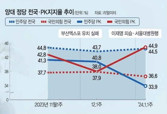 부정평가는 광주·전라(82%→75%), 대전·세종·충청(59%→56%), 부산·울산·경남(57%→55%), 대구·경북(45%→44%)에서 하락폭을 보였으나 인천·경기(59%→62%)와 서울(58%→59%)에선 올랐습니다. 즉, '수도권' 망할 뻔 했다는 것이죠.