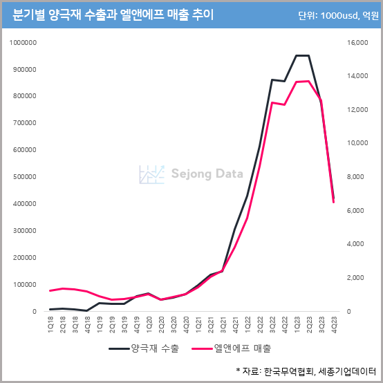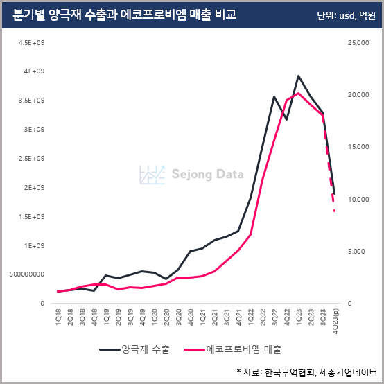 4분기 양극재 수출이 전반적으로 좋지 않았는데, 엘앤에프와 마찬가지로 수출 데이터를 기반으로 에코프로비엠의 매출 규모를 추산해보면 전망보다 더 낮은 1조 원 언더의 매출을 기록할 가능성이 있다 '판단'됩니다.