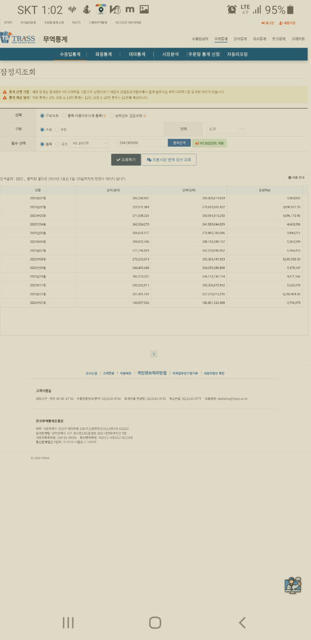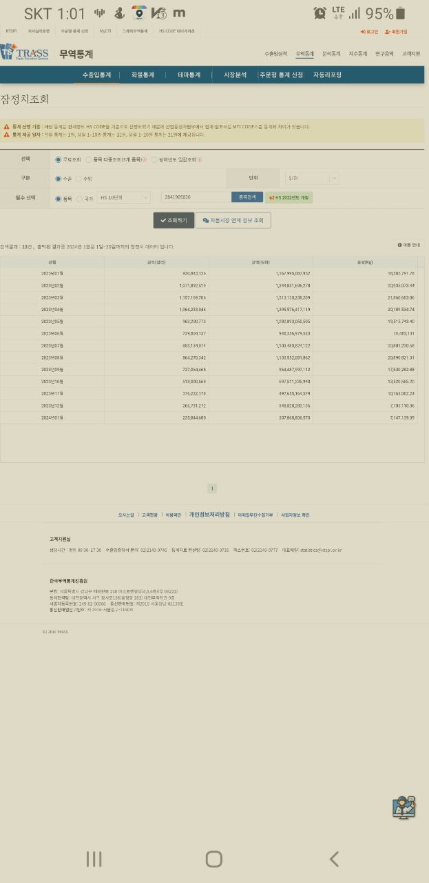 2842909020은 NCM 2841909030은 NCA 입니다. 양극재 수출 1월 20일까지 집계치는 NCM 수출단가는 32,998달러/톤, 전년 동월비 -34%, 일 평균 수출 중량은 357톤으로 전년 동월비 -40% 감소했습니다.