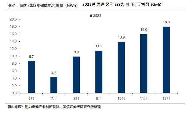 2023년 중국 ESS용 배터리 누적 판매량은 113.4Gwh였으며, 이 중 수출량은 25.2Gwh였습니다.(Guosen Securities 발간 '주간 배터리산업 보고서' 2024. 01. 20)