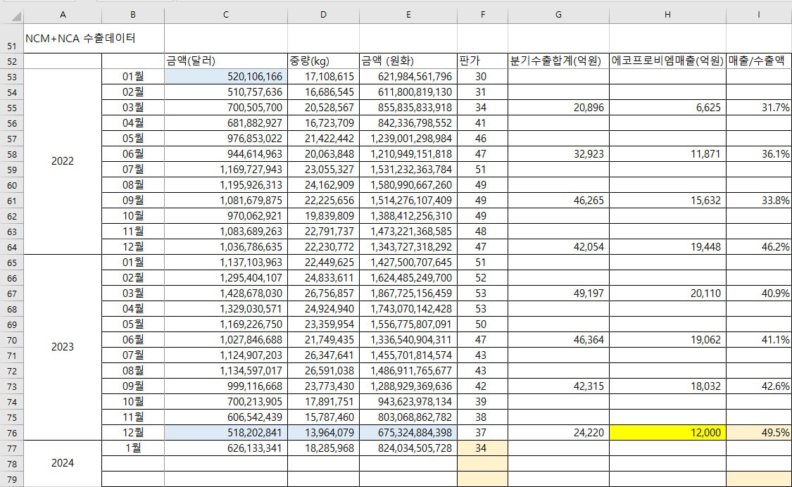 1월 양극재 수출 총액은 전월 대비 상승 + 판가는 하락(전년대비 거의 반토막) = '역마진 질주'를 하는 중입니다. NCM+NCA, 판가 34,241달러/톤 전년비 -32%, 중량 18,286톤 전년비 -19%입니다. NCM이 12월 바닥에서 반등했으나, 전년비 중량 -35%, 금액은 -54%입니다.