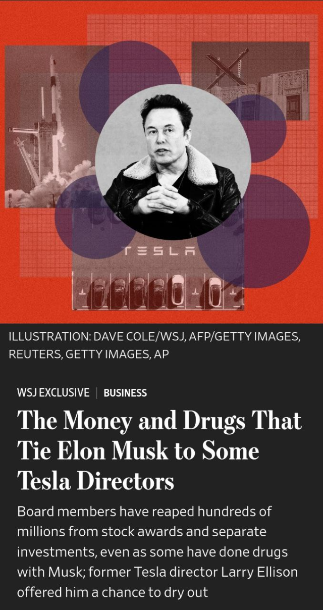 3일(현지시간) WSJ은 복수의 전·현직 테슬라 및 스페이스X 관계자를 취재해 CEO 일론 머스크와 미국 증권거래위원회(SEC)를 통해 확인이 된 테슬라 주식 '매도 계획'으로 뉴욕증시를 폭발시키고, '또 먹튀'를 할 것이라는 우려의 '이사진'(Tesla, Space X)에 관한 새로운 '불법 마약' 파티를 보도했습니다.