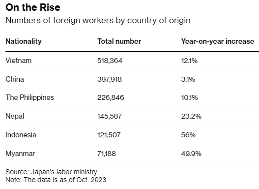일본의 '인구학'적 투쟁은 기업과 지역사회가 전례 없는 속도로 문을 열도록 강요하고 있습니다. 지난달 말 발표된 노동부 통계에 따르면 지난해 외국인 노동자 수는 2022년보다 12.4% 증가한 204만 명을 기록했습니다. 일본이 더 많은 조립 라인 직원, 건설 노동자, 채소 줍는 사람, 노인 간병인을 구하면서 이러한 유입은 빠른 속도로 계속될 것으로 보입니다.