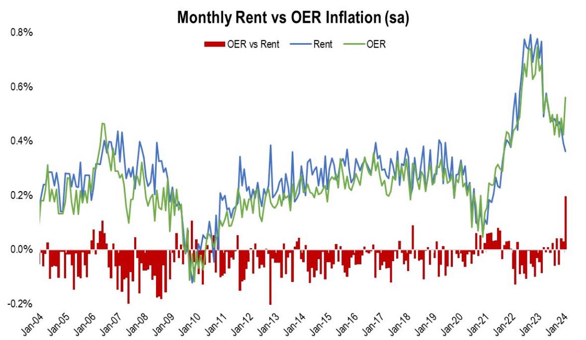 세부항목을 살펴보면 특히 '주거비'가 문제였죠. 0.4%에서 0.6%로 상승폭이 확대됐으며 항공 운임료도 지난 8월 이후 상승폭이 최대치로 확대됐습니다. 주거비는 실제 임대료, 자가소유자의 임대 기회비용, 보험료, 체제비 항목으로 구성됩니다. OER 전월비 증가율은 0.42%에서 0.56%로 상승폭이 확대된 반면, Rent는 0.39%로 0.36%로 축소되면서 OER과 Rent 항목의 차이가 확대되고 있으며 이는 최근 20년 간 보기 드문 현상입니다.