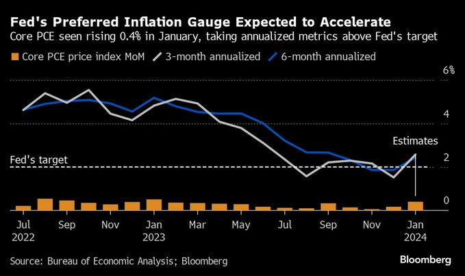 미국의 1월 소비자물가지수(CPI)와 생산자물가지수(PPI)가 시장 예상보다 뜨겁게 나온 가운데 이번주 나올 근원 개인소비지출(PCE) 가격지수 역시 전월비 상승률이 0.4%로 1년래 가장 가팔라진 것으로 우려됩니다.