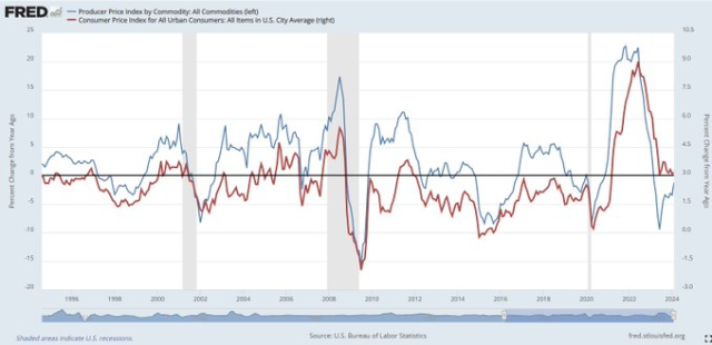 ① 전월대비 PPI 상승률(흰선은 Core PPI 상승률): PPI 상승률 예상은 0.3%였는데, 실제는 0.6%가 나왔으니 시장이 기절할 수치죠. PPI가 CPI에 선행한다는 면에서 이는 '상당히 우려'스러운 숫자였습니다. ② 미국 PPI 상승률(파란선, 좌축) vs CPI 상승률(붉은선, 우축) 요약하면 "PPI(생산자물가지수, 도매가)가 올랐으니 당연히 CPI(소비자물가지수, 소매가)가 오를 것인데 (금리 뇌관)홍해 리스크도 끝날 기미가 보이질 않는다"는 우려가 나옵니다.