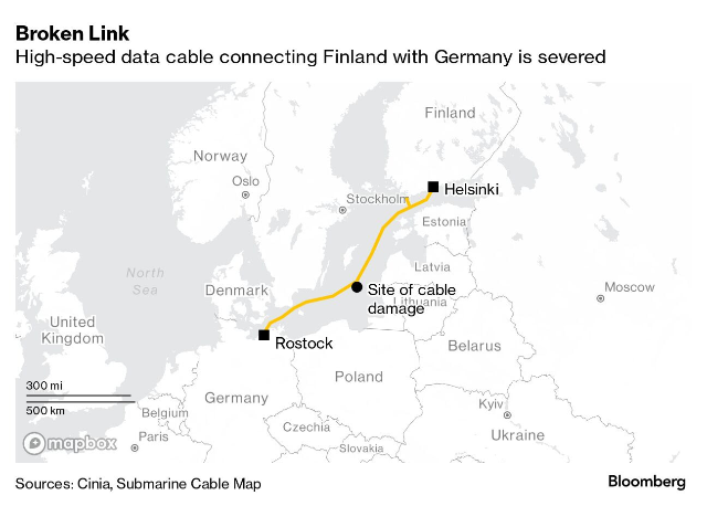 핀란드와 독일을 연결하는 해저 '데이터 케이블'이 월요일 이른 시간에 끊겼다고 당국이 밝혔습니다. 1,200킬로미터의 고속 광섬유 헬싱키-로스톡 연결선이 스웨덴 남부 동쪽 발트해에서 손상되었습니다. 보리스 피스토리우스 '독일' 국방부 장관은 피해를 사보타주 행위로 조사해야 한다며 러시아가 유럽연합에 하이브리드 및 군사적 위협을 가하고 있다고 지적했습니다.