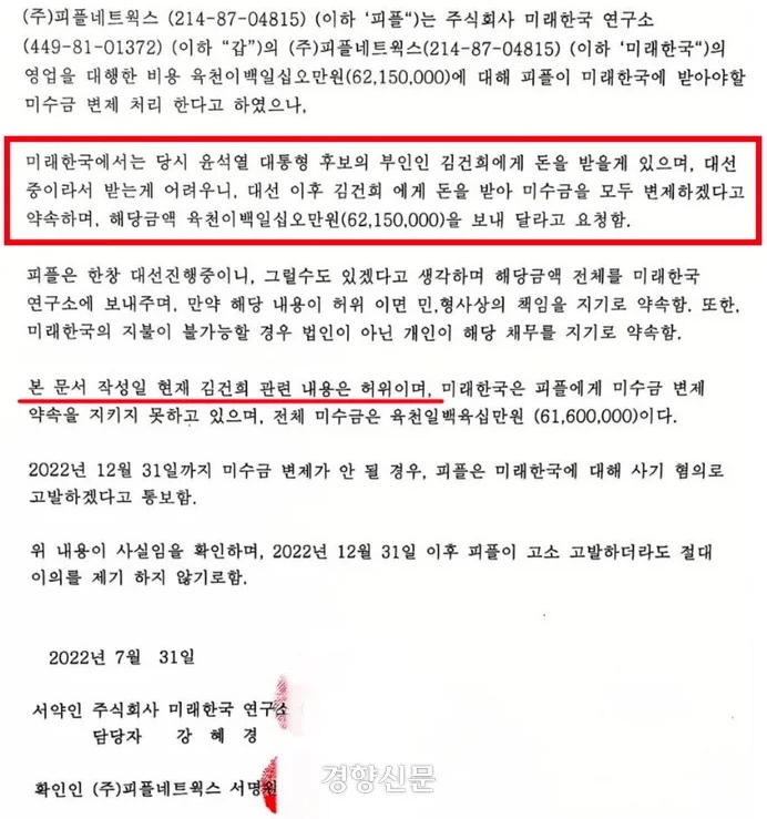 더불어민주당이 '윤로남불' 부부 국정농단('구속 사유') 핵심관계자 '명태균' 씨가 실질적으로 운영한 것으로 알려진 미래한국연구소가 피플네트웍스리서치(PNR)에 '윤석열' 부인인 '김건희'에게 '대선 후' 돈을 받아 미수금을 갚겠다고 '6천만원'을 받아가며 작성해준 채무이행각서 실물을 '공개'했습니다. 이어 대선 기간 여론조사를 '무상 제공'을 받은 혐의로 '윤석열' 부부를 '정치자금법' 위반 혐의로 '윤로남불' 검찰에 고발했습니다.
