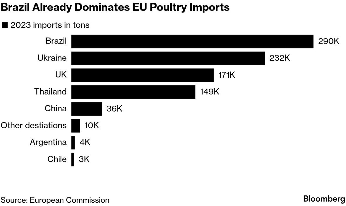Rabobank에 따르면 이는 특히 소고기 및 가금류 산업에서 두드러집니다. 이 협정은 '브라질', '아르헨티나', 우루과이와 같은 국가를 포함하는 메르코수르 블록의 상품에 쿼터를 할당합니다. 약 99,000톤의 소고기는 우대 세율로 EU에 반입될 예정이며, 가금류 수입품은 18만 톤의 면세 쿼터를 받게 됩니다.