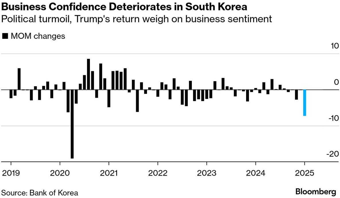 '한국'의 기업 '신뢰도'는 코로나19의 글로벌 확산 이후 가장 크게 악화되었으며, 이는 정치적 혼란과 '트럼프'의 '관세' 위협에 직면한 경제에 대한 우려가 커지고 있음을 '반영'한 것입니다. 금요일에 발표된 데이터에 따르면 한국은행 종합심리지수에서 1월 기업 전망은 7.3p 하락한 82.4를 기록하여 2020년 4월 이후 전월 대비 가장 큰 폭으로 하락했습니다.