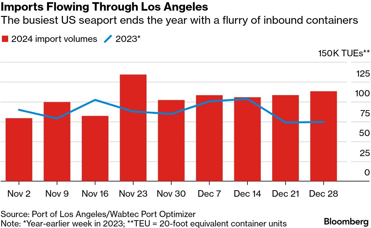 월요일 Wabtec Port Optimizer의 최신 '수치'에 따르면 이번 홀리데이 주간 로스앤젤레스 항구는 약 129,000개의 인바운드 '컨테이너'를 처리할 예정이며, 이는 1년 전과 비교했을 때 73% 증가한 수치입니다. '내년'에는 2023년 팬데믹 이후의 침체에서 '수입'이 반등한 강력한 한 해가 될 것입니다.