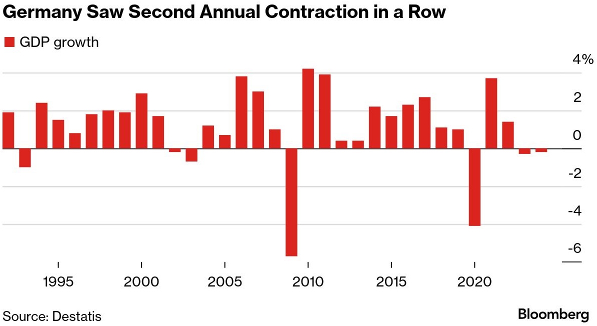 '독일'은 2023년에 주요 7개국(G7) 경제국 중 유일하게 경제 규모가 축소되었으며 2024년 연간 수치를 발표한 최초의 국가입니다. 그러나 2025년 전망은 여전히 암울합니다. '독일' 연방은행(Bundesbank) 0.2% 성장에 그칠 것으로 예상하며 트럼프가 관세 위협을 준수할 경우 또 다른 '위축'이 가능하다고 경고합니다.