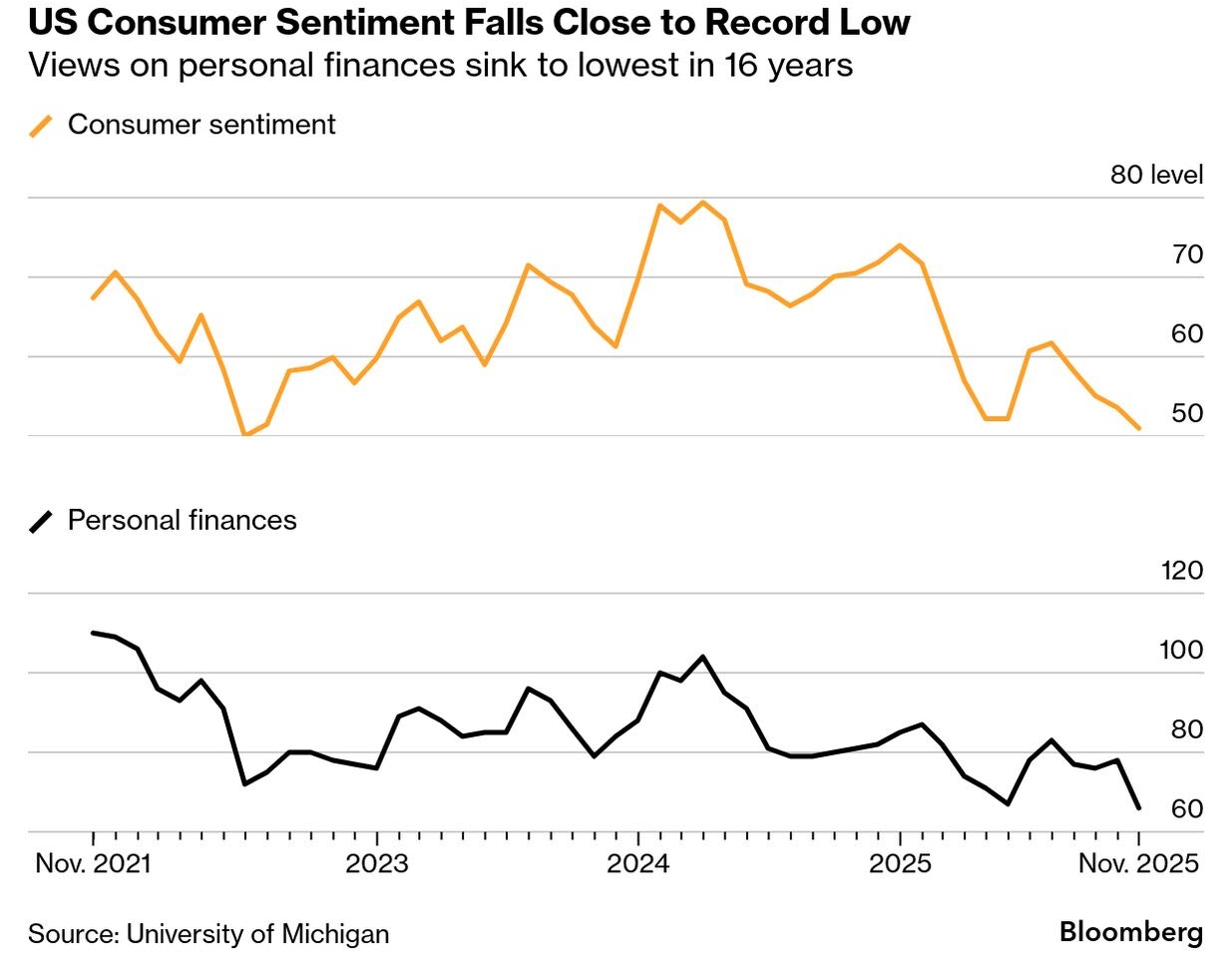미국인들의 '지갑 사정'은 '어두워' 보입니다. 물가상승률이 3%를 기록하고 실업률이 4.4%로 상승하면서, 3대 악재 중 세 번째인 미국 소비자 심리는 사상 최저 수준으로 떨어졌습니다 미시간 대학교에 따르면 11월 최종 심리 지수는 10월 53.6에서 51로 하락했습니다. 개인 재정에 대한 전망은 2009년 이후 가장 어두웠습니다.